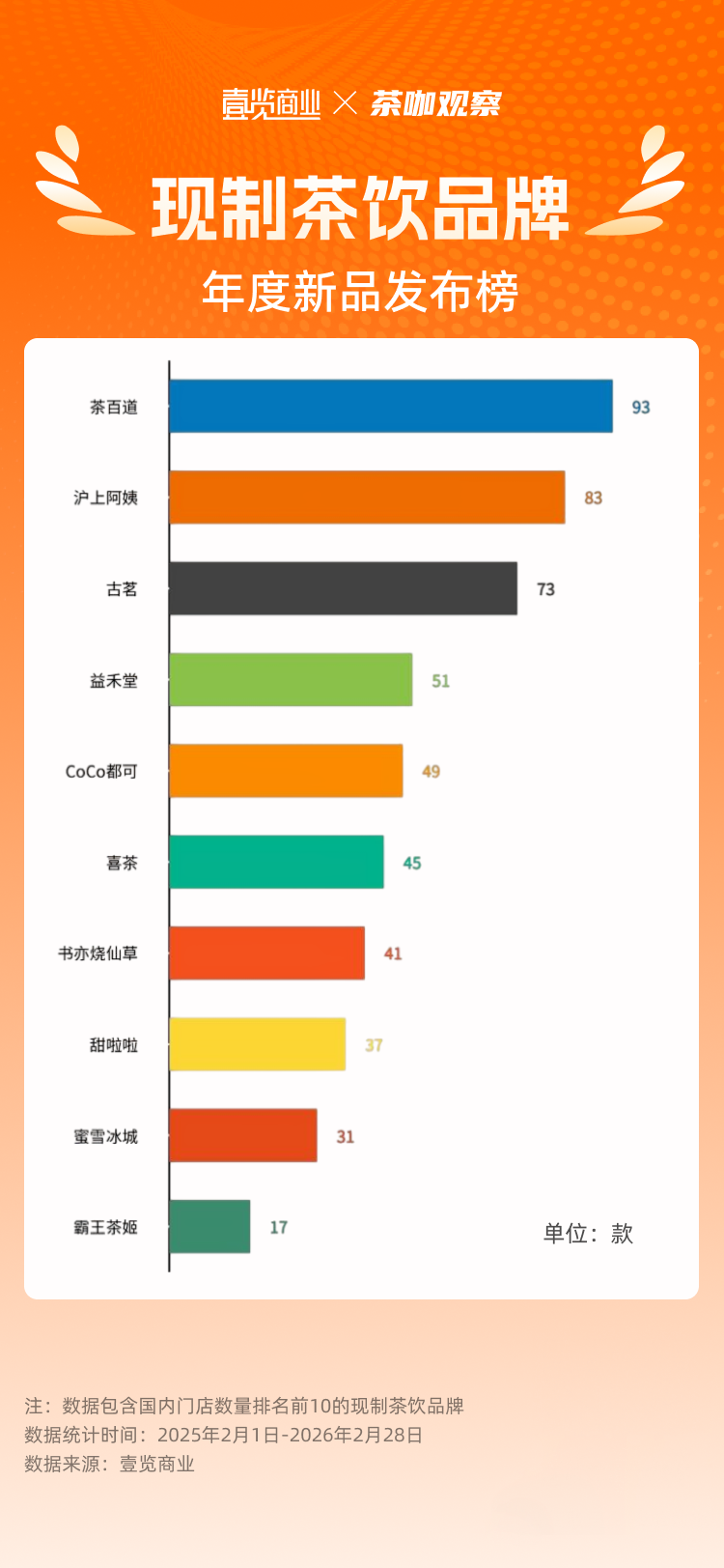 壹览商业数据显示,2025年2至2026年2月,门店数量前10的现制茶饮品牌中,不同茶饮品牌上新策略分化明显。