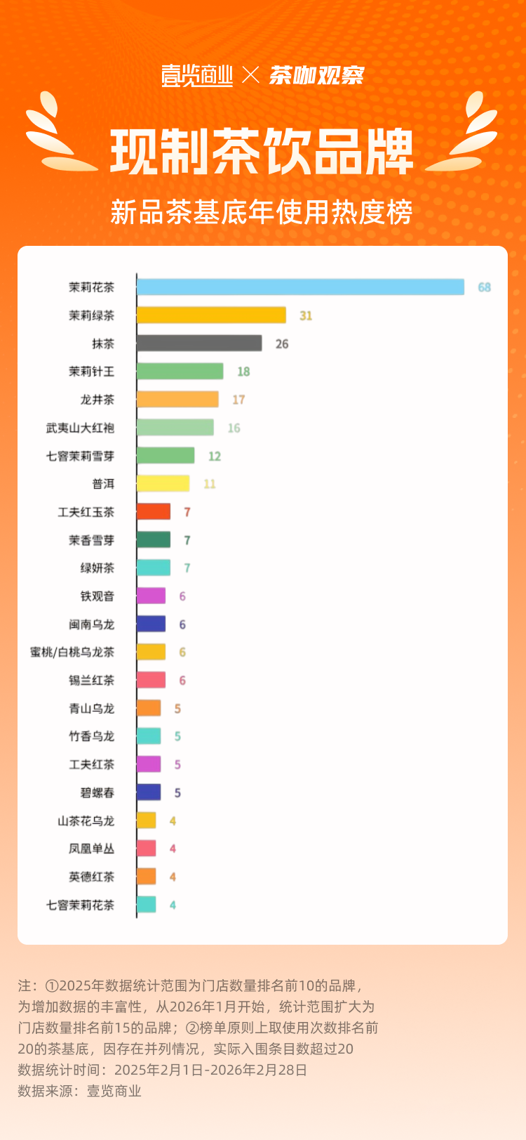 从新品的茶基底使用情况来看,茉莉花茶成为最热门的茶基底选择,共使用68次,保持断层领先;茉莉绿茶使用了31次,位居其次;抹茶使用了26次,排在第三,品牌用抹茶为饮品带来特殊风味,打造差异化记忆点。