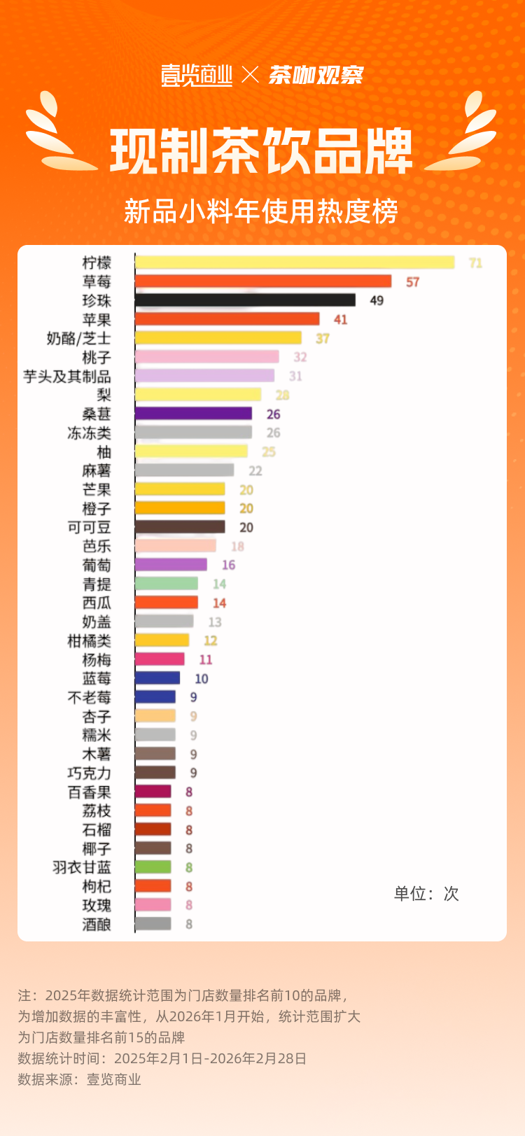 从新品的小料使用情况来看,柠檬以71次断层领先,草莓以57次的使用排在第二,柠檬、草莓、桃子、梨、桑葚等水果纷纷上榜,是由于水果类小料具有天然的健康属性、丰富的口感层次和季节性更新空间,是成为品牌推新的核心抓手。