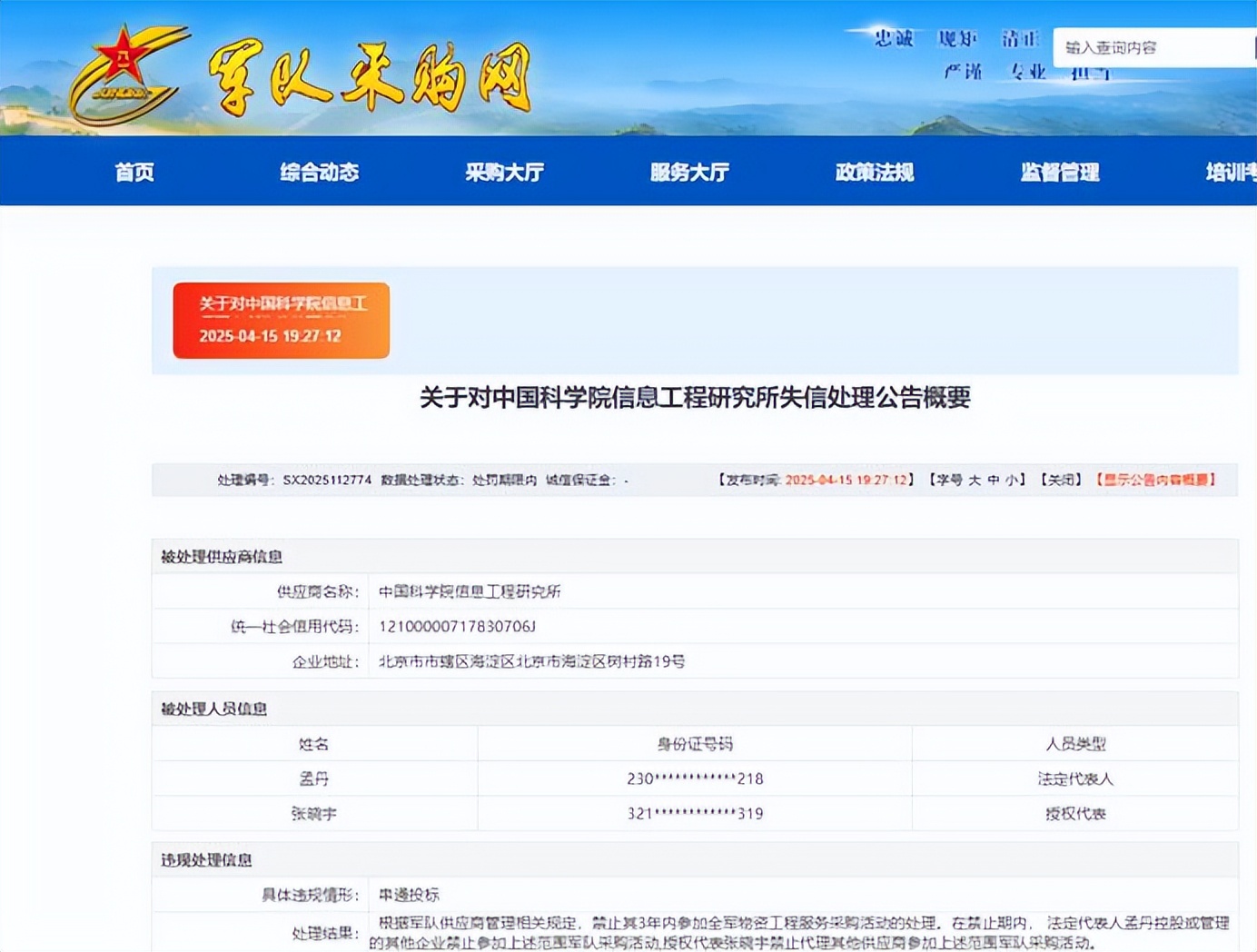 4月15日,军队采购网发布《关于对中国科学院信息工程研究所失信处理公告概要》。因存在串通投标的违规情形,根据军队供应商管理相关规定,禁止其3年内参加全军物资工程服务采购活动的处理。在禁止期内,法定代表人孟丹控股或管理的其他企业禁止参加上述范围军队采购活动,授权代表张晓宇禁止代理其他供应商参加上述范围军队采购活动。