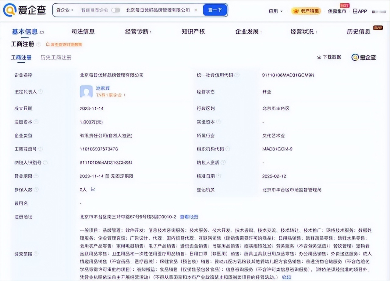 爱企查App显示,北京每日优鲜品牌管理有限公司成立于2023年11月,法定代表人为池家辉,注册资本1000万元人民币,经营范围包括日用品销售、新鲜蔬菜零售、新鲜水果零售、食用农产品(6.870, -0.01, -0.15%)零售等。股东信息显示,该公司由池家辉全资持股。
