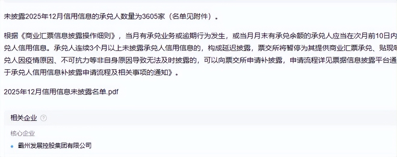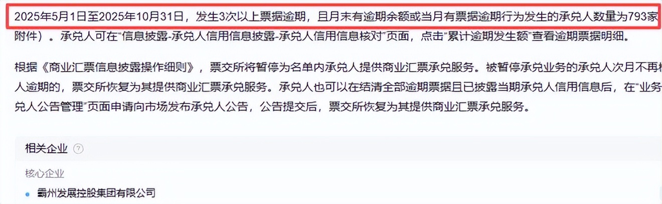 担保方霸州发展自身信用状况堪忧。上海票据交易所2025年11月7日公告显示,在2025年5月1日至10月31日期间,霸州发展发生3次以上票据逾期,且存在月末逾期余额或当月新增逾期行为,已被暂停商业汇票承兑服务。此外,2026年1月14日,票交所再次披露,霸州发展未按期披露2025年12月信用信息,进一步加剧市场对其履约能力的质疑。