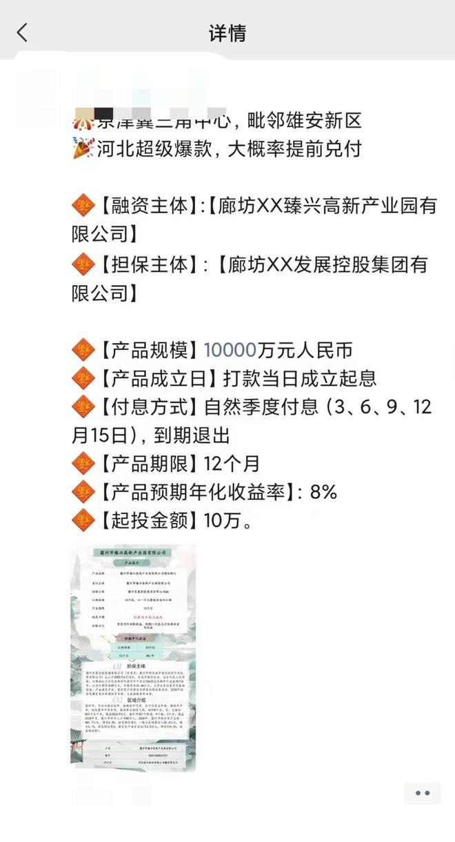 根据投资者提供的材料,该产品由霸州市臻兴高新产业园有限公司(以下简称“霸州高新”)作为发行方,霸州发展控股集团有限公司(以下简称“霸州发展”)提供担保,总规模1亿元,起投金额10万元。产品承诺每季度15号分配收益,到期一次性兑付全额本金及收益。