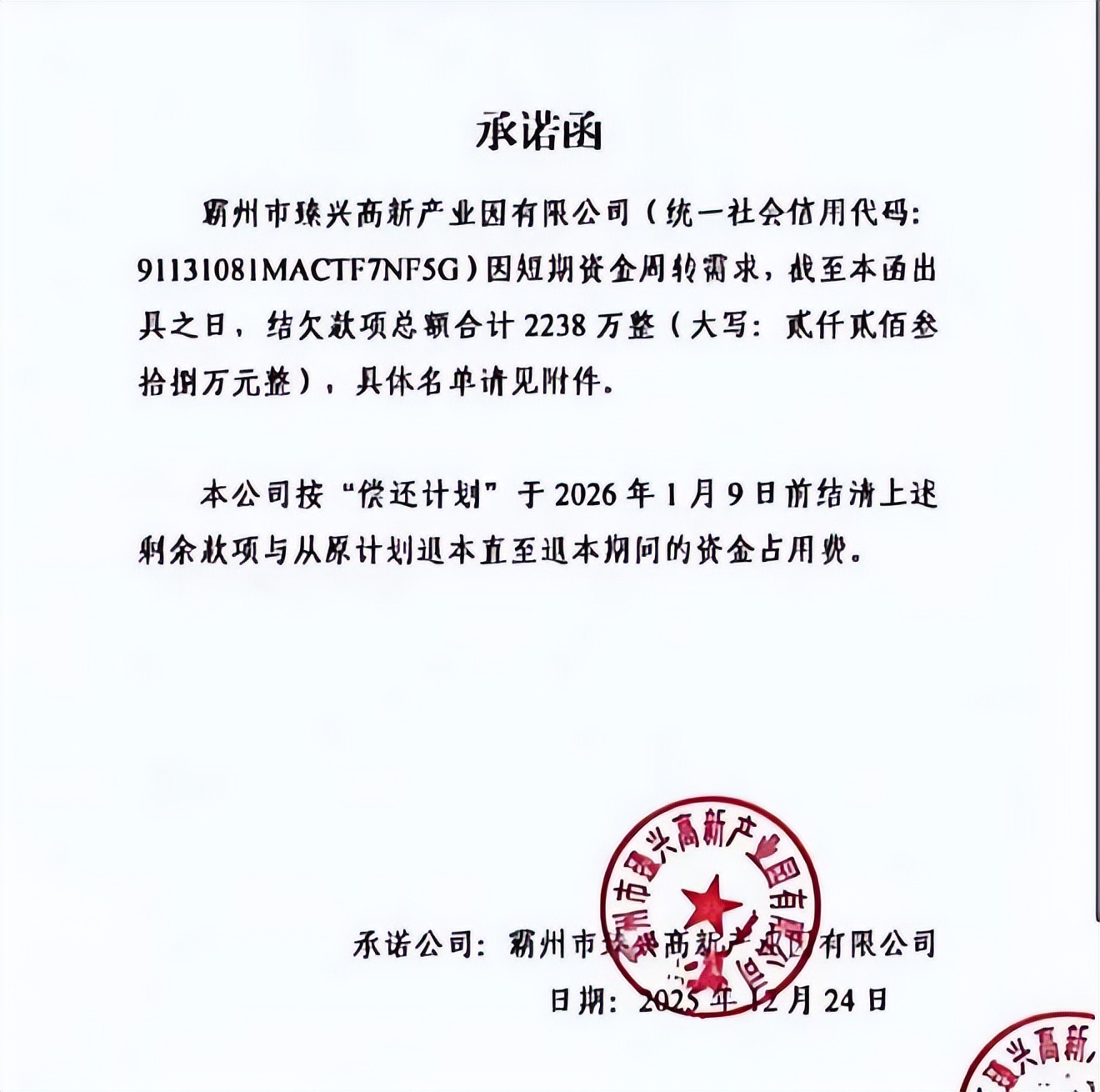 另据风口财经了解,霸州高新曾于2025年12月24日出具书面承诺函,称因短期资金周转需求,结欠款项合计2238万元,并承诺于2026年1月9日前全部结清。但截至该日期,上述款项仍未清偿。