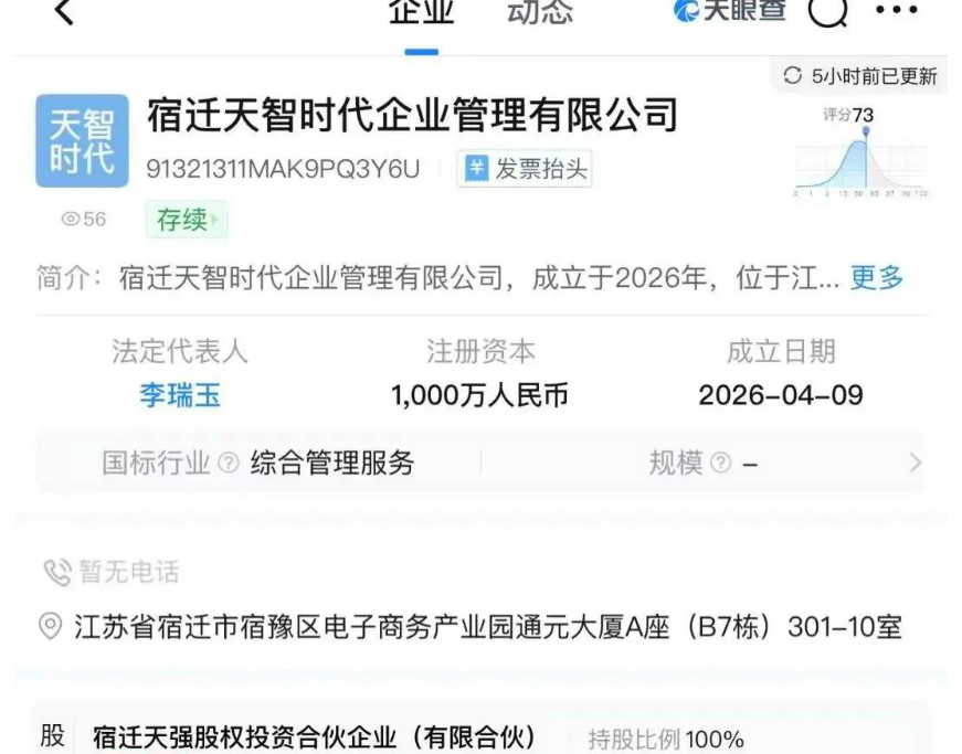 工商信息显示,刘强东与章泽天夫妇近日在江苏宿迁共同布局的家族资本版图再添新成员。宿迁天强企业管理有限公司于 4 月 9 日正式成立,注册资本 1000 万元人民币,法定代表人为李瑞玉,由刘强东、章泽天共同持股的北京天强坤泰投资管理有限公司(下称 “天强坤泰”)全资持股。这是继私募股权投资领域布局后,二人围绕 “天强” 品牌搭建的又一核心载体,标志着家族资本从投资端向管理与服务端延伸。