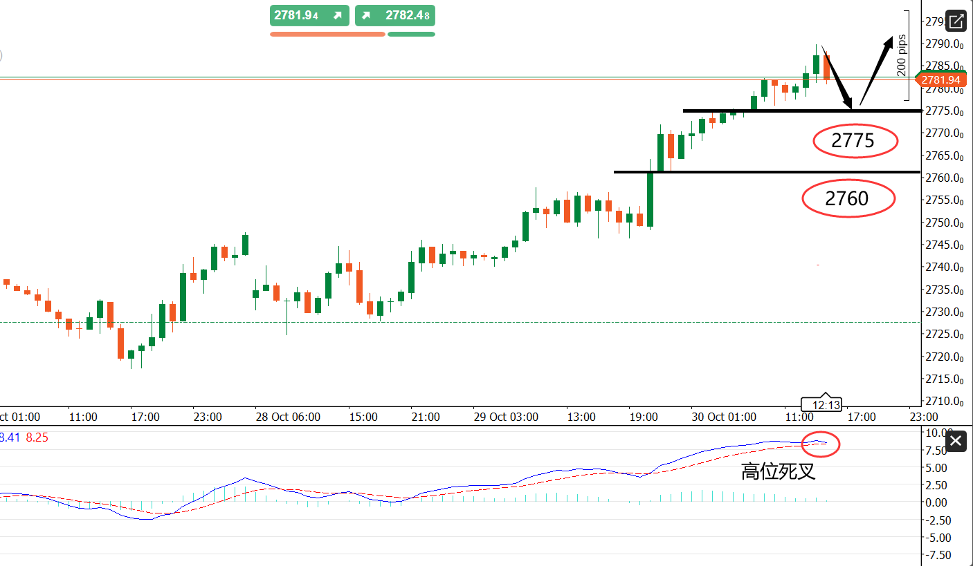 但是现在一小时的图,黄金的macd快慢线现在是在高位啊,多头动能柱放量现在已经是开启衰弱了,也就是说本次的高位但凡形成死叉,k线的修复就来了,黄金至少会进行一波可观的回调,因为晚间还是数据领军,所以我们刚才说的2777第一回调点位就不合适了,所以我们等待今晚数据之后低点回调的机会,一定要等,不要贸然进场,就算我们今天没机会接,也不要强行进场,我们等待到明天进场也比今天贸然进场好。