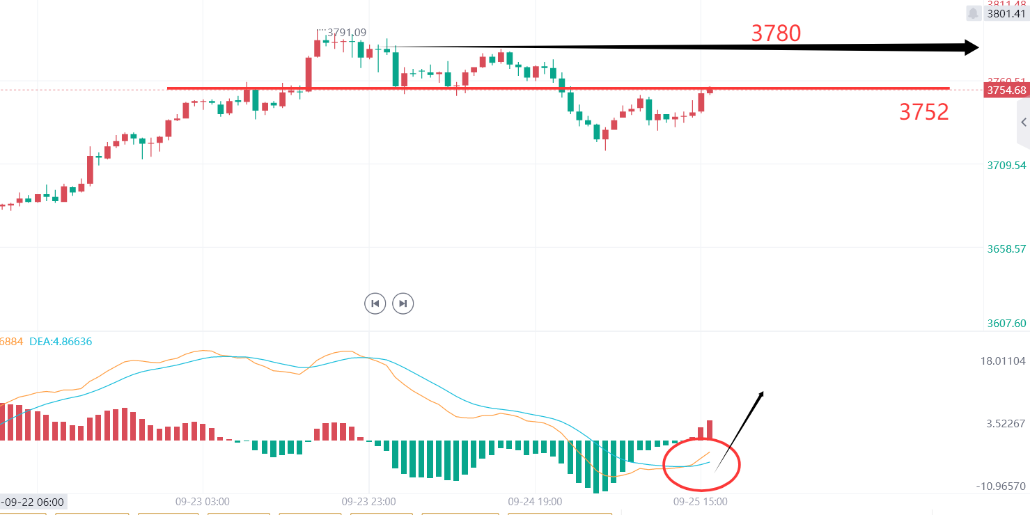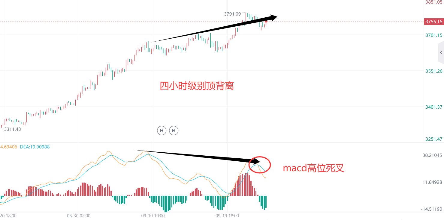 直接拿着今年的五一假期,当时受到的影响可是关税落地啊,黄金在五一假期期间,五一期间的前两天黄金走的下跌力度让很多做国内金的害怕了,结果就是假期没玩好,黄金也做不了就是煎熬,上一年的十月一假期不也是一模一样吗?先跌两三天,后边再给你拉回来,但当时的高点和现在的高点可不太一样啊?!而且我们也要有展望,毕竟四小时级别给出来信号了,我在上文提到的日线级别,也是经过四小时级别来走的,所以如果四小时级别给出来这样的死叉之后,我来配合着现在的日线级别macd高位的持续再走第二段即将形成死叉的信号,那这个周期就正好在现在的国庆节假期前后,所以我建议在现在这个节骨眼上,你要是真的想加仓看波黄金上涨,就尽早进场,因为震荡黄金跌下来的时候,你就开始怀疑当时进场还是不是一个好时机了,而且再晚几天马上停盘了,你进场了,那你就剩看的份了。