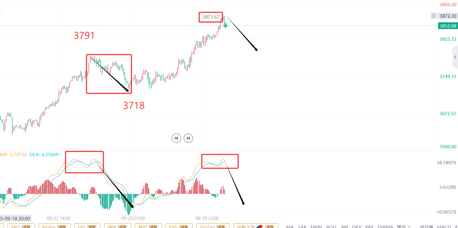 好家伙说啥来杀,今天上午还在跟客户说,会不会下午三点沪金停盘之后黄金直接开跌,然后中午睡醒来公司看到黄金就已经开始跌了,而且这个跌幅看着确实是非常可观的,那接下来我们将要进行的当然就是寻求高位开空,甚至这个下跌将会持续到国庆开始的前两三天都会如此,正好这星期结束哈哈哈。虽然说现在的小时线没有什么特别大的用处,但是现在的行情完美复刻了之前一波的行情,小时线macd的高位反复震荡,之后的回调是直接从高点的3791回至3718,那之后当然要尝试在现在的这个节骨眼上看黄金回调下落,同样的场景同样的周期,凭什么不跌呢?