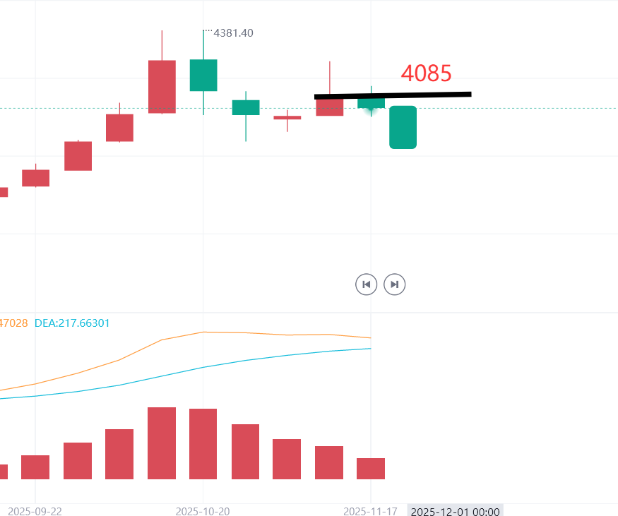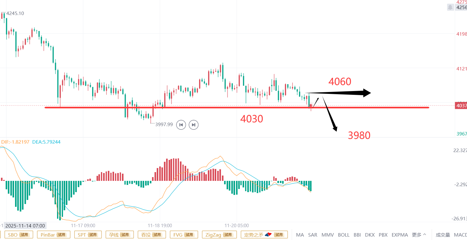 在探讨周内级别的开盘价时,上周黄金最终收盘价定格于4085。本周内,黄金呈现十字星走势。若今日黄金价格未下跌,或者在跌至4030后开启直线反弹,本周将以周内十字星形态收盘,如此一来,下跌预期只能顺延至下周。然而,在今晚行情尚未结束之际,需重点关注4030这一关键价位的得失。若该价位被跌破,黄金价格将进一步下探至更低水平,不仅可能跌破4000整数关口,甚至可能触及3980,日内跌幅可达100个点。