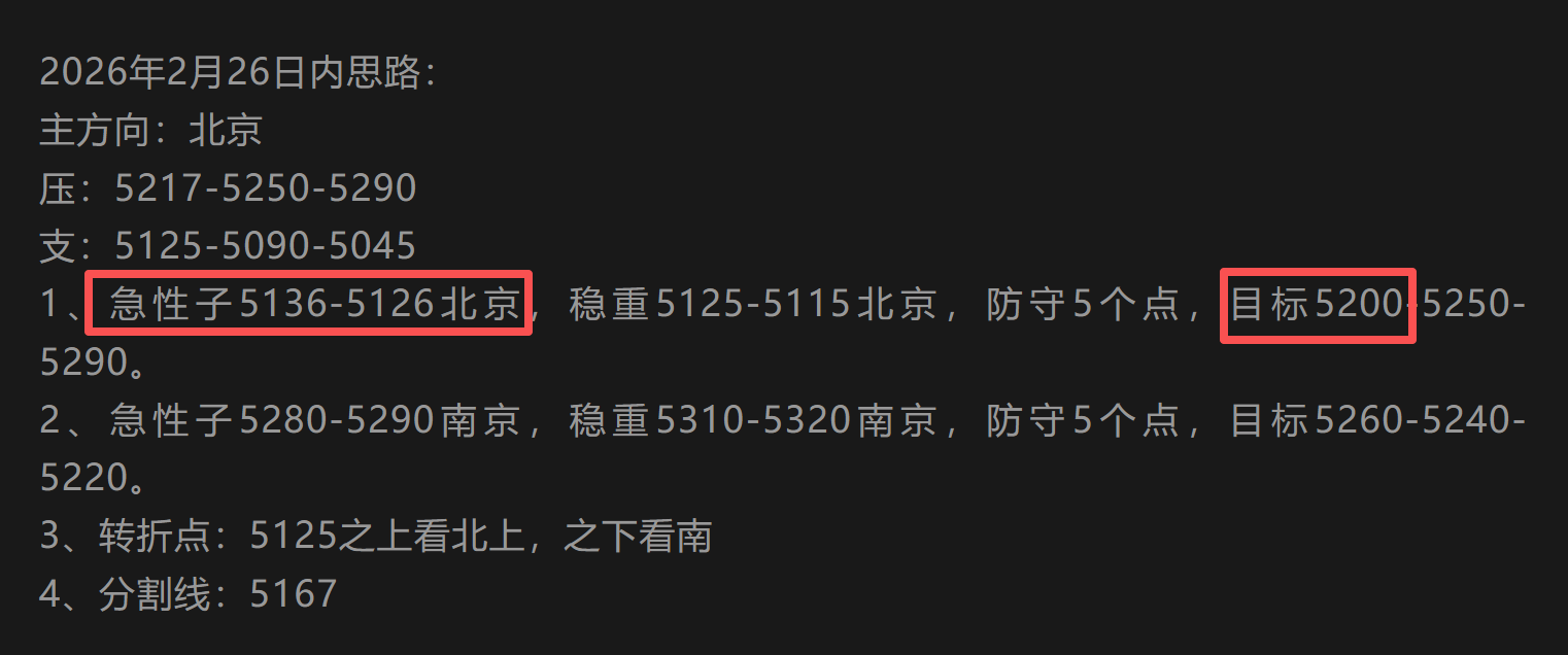 不过,值得欣慰的是,昨日的交易思路依然展现出了其独到的见解与前瞻性。晚间时分,当市场情绪趋于谨慎,金价在5130附近徘徊不定时,公众号果断给出了看多信号,并预判金价有望抵达5200一线。事实也正如预期般发展,金价在经历了一番波折后,最终成功触及并短暂站稳了5200关口,为关注者带来了实实在在的收益。