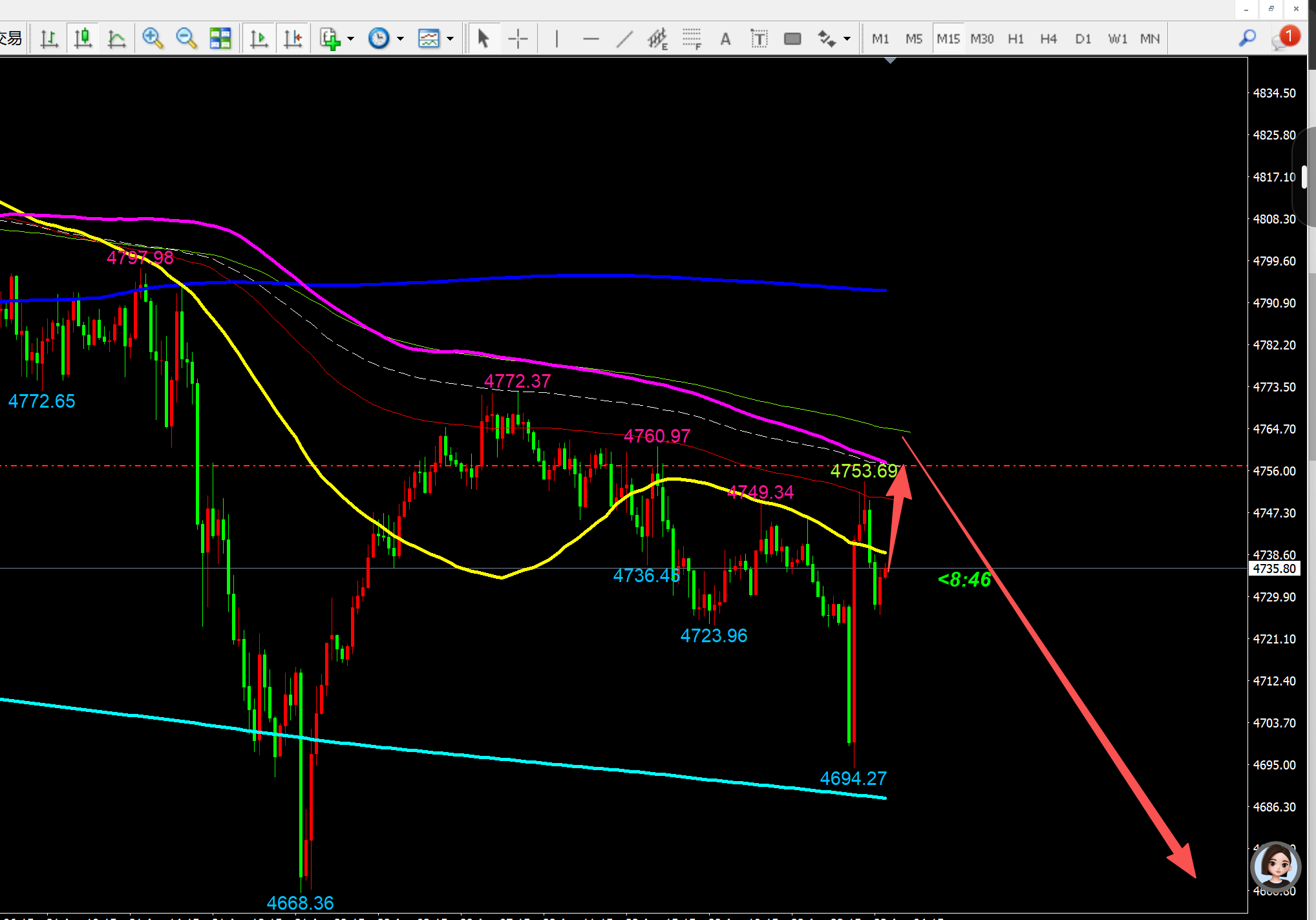 黄金市场风云变幻,行情走势犹如坐过山车般跌宕起伏。昨日黄金早盘开启强势上涨模式,一路高歌猛进至4772附近,然而多头攻势未能持续,在此处遭遇强大阻力,随后价格迅速回落,一路下探至4723。今早开盘,黄金更是延续跌势,直接跌至4694一线,市场波动之剧烈令人咋舌。