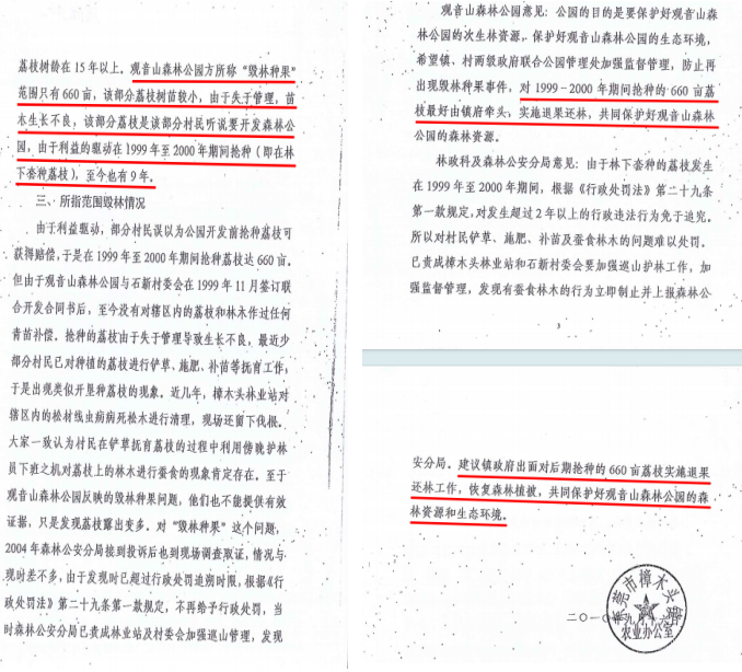 2、有关660亩原始次生林被石新村民毁掉种上荔枝树的举报和诉讼