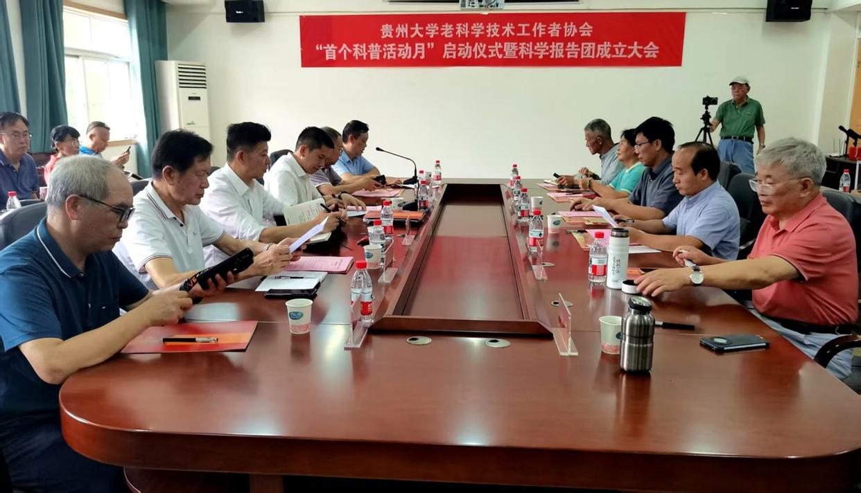 今天的大会宣告“首个科普活动月”正式启动和老科协科学报告团正式成立,这本身就是“首个科普活动月”的重头戏活动!正式拉开了贵大老科协“首个科普活动月”序幕。接下来的金秋九月,贵大老科协将以学校为基地 多轮驱动,辐射全省实施“首个科普活动月”行动:一是开展高校科普巡讲,拟联合贵州理工学院、贵州工贸学院等高校开展专题科学报告,主题包括“强化生态环境,建设美丽中国”.“贵州生态保护与可持续发展”等。二是选取铜仁市、花溪区两个乡村振兴重点帮扶县乡,宣讲“乡村振兴战略及实操案例”,继续开展农业技术培训、数字化技能普及(如智慧农业应用)等科普讲座,惠及基层群众与乡村干部。三是参与贵州省第八届生态黑茶产业高质量发展(安顺)大会 ,请老科协专家做“黑茶营养价值与开发利用技术”报告!四是与省农业农村厅、林业局合作,参与“科技下乡”活动,提供林业碳汇、特色种植、养殖等专业技术支持,并推广贵州大学的科研成果。五是组织校内离退休教职工参与科普讲座、贵大老年运动会、教师节、重阳节文艺汇演等文体活动,鼓励具备条件的老科技工作者加入科学报告团,发挥余热。六是在已选派报告团成员参加贵州省第四届科普短视频大赛培训基础上,制作“科学家故事”“贵州特色科技”等主题短视频,通过抖音、微信视频号等平台传播。七是联合天眼新闻、今日头条等媒体,报道活动亮点;在校园及社区活动场地悬挂横幅、发放科普手册,同步利用“科普中国”平台扩大影响力。