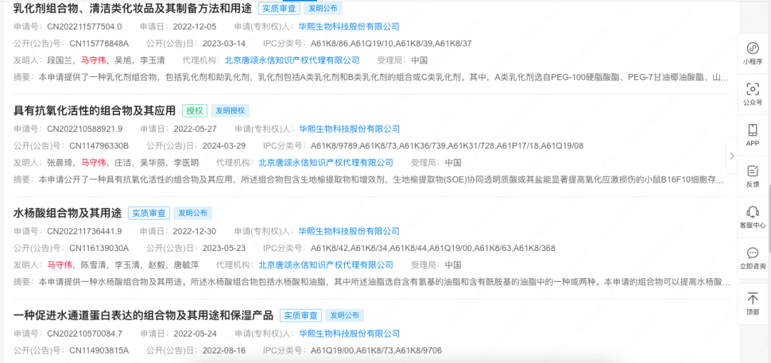 企查查显示,马守伟在华熙生物工作期间,参与申请20项专利,涉及清洁类、抗氧化类、水杨酸类等产品。2022年年报中,华熙生物还对马守伟的工作表达“认可”,指出其开发了现象级产品一例。但并未指出具体产品。