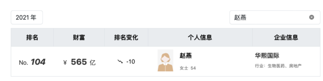 顺着行业风口,2021年7月5日,华熙生物股价达到巅峰,为313.48元/股,市值高达1511亿元。赵燕成为科创板首富。胡润百富榜显示,这一年,赵燕的财富值达到565亿元,排名104。