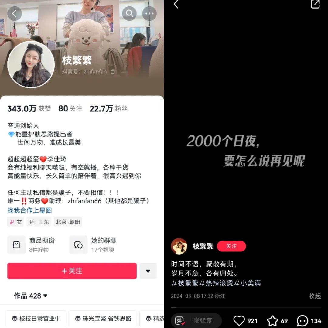 夸迪的核心骨干、主理人枝繁繁也已经离职。据自媒体“青眼号外”报道,枝繁繁回应表示,“我们创始人集体被离职还没交接”“以后夸迪跟我无关啦”。据果集·飞瓜数据显示,2022年四季度,枝繁繁账号直播预估销售额达到夸迪整体抖音达播预估销售额的40%以上。