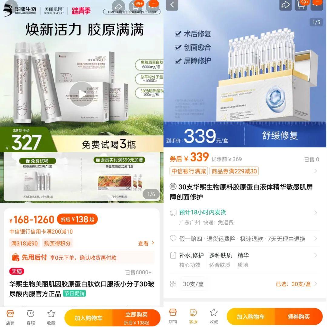 淘宝显示,华熙生物的胶原蛋白精华30支的价格为339元,胶原蛋白肽饮口服液一盒十瓶,售价138元。