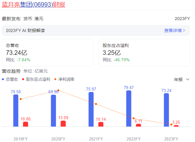 前不久,蓝月亮发布了2023年全年业绩公告,总营收、股东应占溢利、净利润率三降的蓝月亮,交出了近三年来最差的成绩单。具体来看,2023年,蓝月亮实现总营收73.24亿港元,同比下降7.84%;股东应占溢利为3.25亿港元,同比下降46.79%;净利润率为4.44%,同比下降42.26%。而在去年的“2023中国消费品市场发展大会暨第三十一届中国市场商品销售统计结果发布会”上,蓝月亮洗衣液连续14年获同类产品市场综合占有率第一,洗手液连续11年获同类产品市场综合占有率第一,同时,蓝月亮2019年股东应占溢利就已超过10亿港元。