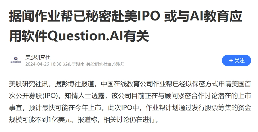 自2022年起,作业帮就开始布局出海业务;2024年,公司旗下海外产品Question AI成功拿下了近200万周活跃用户。此前,有业内人士分析,作业帮此次赴美IPO的重启就可能与Question AI的亮眼表现有关。