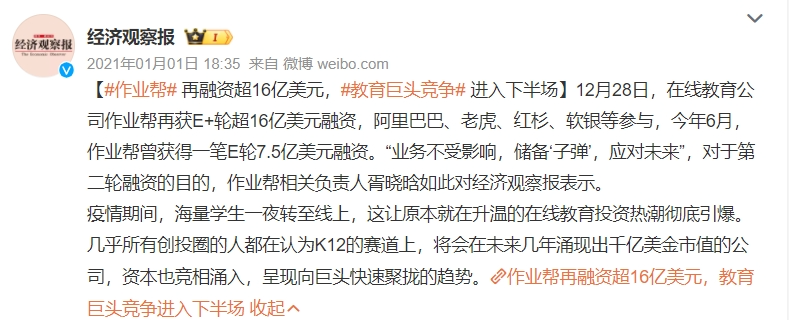 不仅是“出身名门”,从资本的角度来看,作业帮也算是“生而逢时”,作业帮那几年堪称是在线教育界的“资本宠儿”。