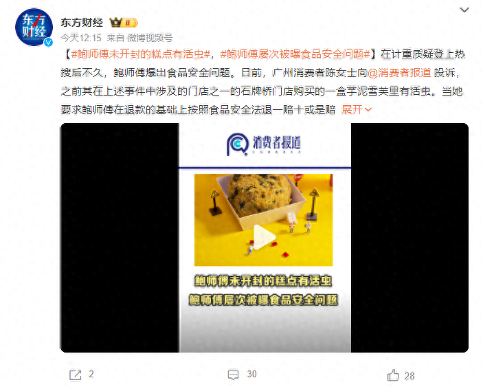 称重事件还没过去几天,鲍师傅又因食品安全问题引发关注。曾经门庭若市、备受消费者喜爱的鲍师傅,近年来屡次出现问题,背后是何原因呢?