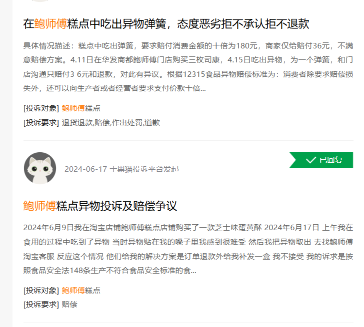 去年,有消费者在鲍师傅的山楂酥中吃出了疑似指甲的异物,但鲍师傅表示,可能是不小心带进去的肉松,师傅制作时会全身包裹,不会出现指甲。更早之前,还有消费者在鲍师傅的产品中发现了带毛囊的毛发和虫子,尽管鲍师傅表示不可能出现毛发,发现虫子的网友也称是因为自己疏忽,但还是无法打消网友的疑虑。黑猫投诉平台上,有多位网友投诉在鲍师傅糕点中吃出了毛发、活虫、弹簧等异物,也有网友投诉鲍师傅糕点发霉、不新鲜等。