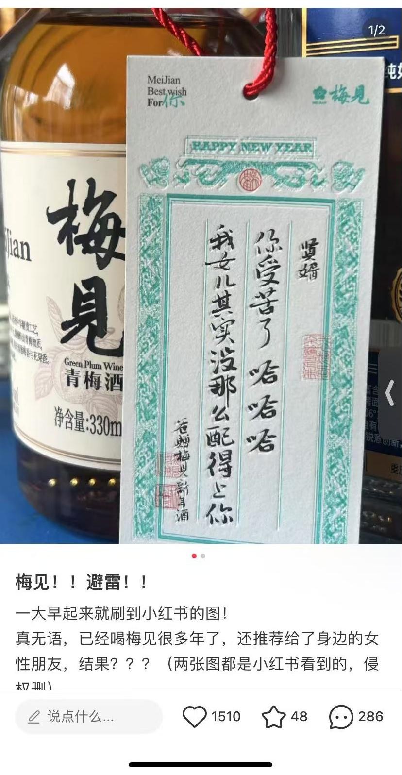 近日,网上出现了多条梅见的避雷帖。据网友发布的帖子,梅见的新年包装上,写着“贤婿,你受苦了,哈哈哈,我女儿其实没那么配得上你。爸赠梅见新年酒”、“姐们儿,祝你新一年兜里的钱像男人一样够花”、“郑重声明,每次妈妈说你的时候,我没有附和哦”等文字。