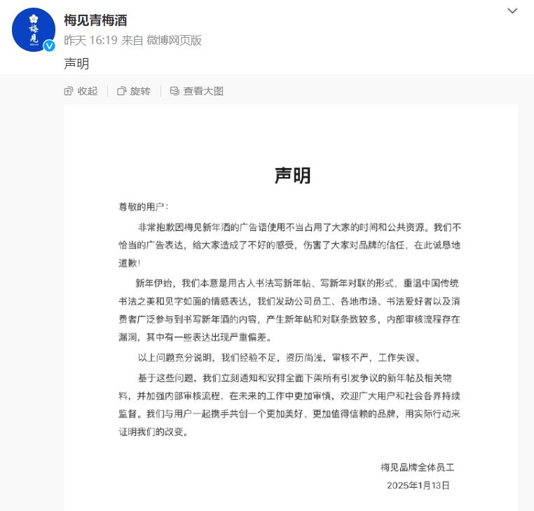 1月13日下午,梅见青梅酒官方账号就此事发布了声明。梅见在声明中表示,“我们本意是用古人书法写新年帖、写新年对联的形式,重温中国传统书法之美和见字如画的情感表达,我们发动公司员工、各地市场、书法爱好者以及消费者广泛参与到书写新年酒的内容,产生新年帖和对联条数较多,内部审核流程存在漏洞,其中有一些表达出现严重偏差”。梅见承认审核不严,工作失误,表示将立刻通知和安排全面下架所有引发争议的新年帖及相关物料,并加强内部审核流程,声明署名为“梅见品牌全体员工”。