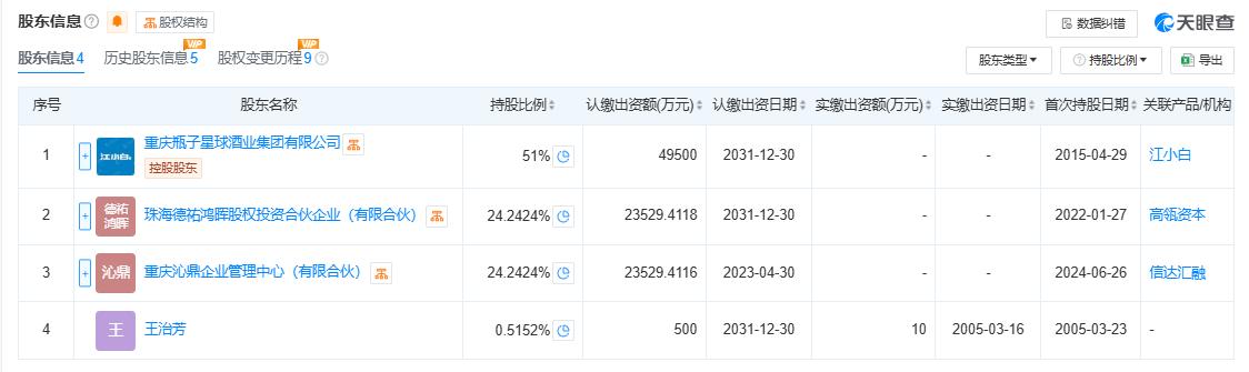 通过营销在市场站稳脚跟,梅见的打法与当年的江小白几乎如出一辙,事实上,梅见与江小白确实存在着千丝万缕的联系。天眼查显示,梅见背后是重庆江记酒庄有限公司,2019年至今,已获得了来自高瓴资本、华信集团、信达汇融的三轮融资,融资金额超过10亿元。而该公司的控股股东,为持股51%的重庆瓶子星球酒业集团有限公司。
