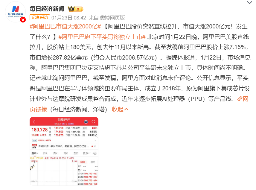相比之下,1月23日,摩根大通中国证券研究团队研报表示,参照同业估值测算,平头哥的潜在估值可能在250亿至620亿美元之间,约占阿里当前市值的6%到14%。