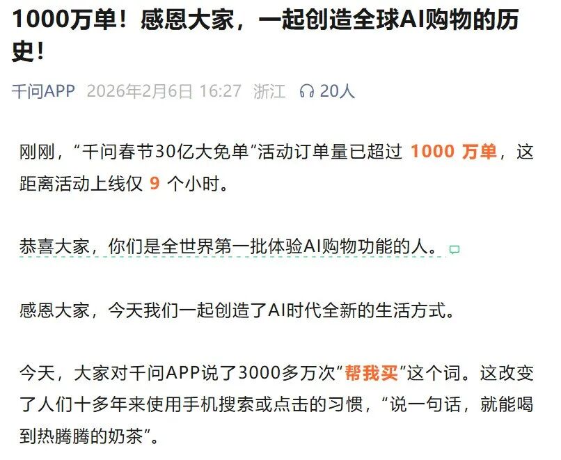 2月6日,千问APP的“春节30亿元大免单”活动上线,大量用户瞬间涌入千问体验AI买奶茶,甚至一度挤崩了服务器,也让线下茶饮店大爆单;据千问数据,上线9小时后,此次免单活动订单量已超过 1000万单。