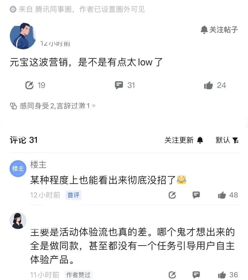 然而,红包玩法只能给新用户带来浅层的交互体验,无法让用户感知到AI 在工作或生活中的不可替代性。有腾讯员工在社媒平台吐槽元宝红包的营销方式“很Low”,全是“做同款”类型的任务,没有一个任务引导用户自主体验产品。