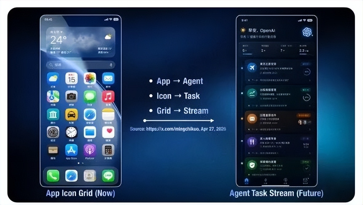 郭明錤分享了他眼中的AI手机概念图,在未来形态的手机中,APP都会消失,前端被一系列能执行任务的Agent替代。