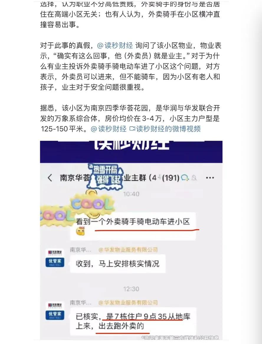 这几天微信群流传的一张截图意外成了微博热门话题:南京一个小区禁止外卖骑手骑电动车进小区,物业接到反馈后立马去核实,最后发现开电动车进小区的外卖员其实是小区业主。