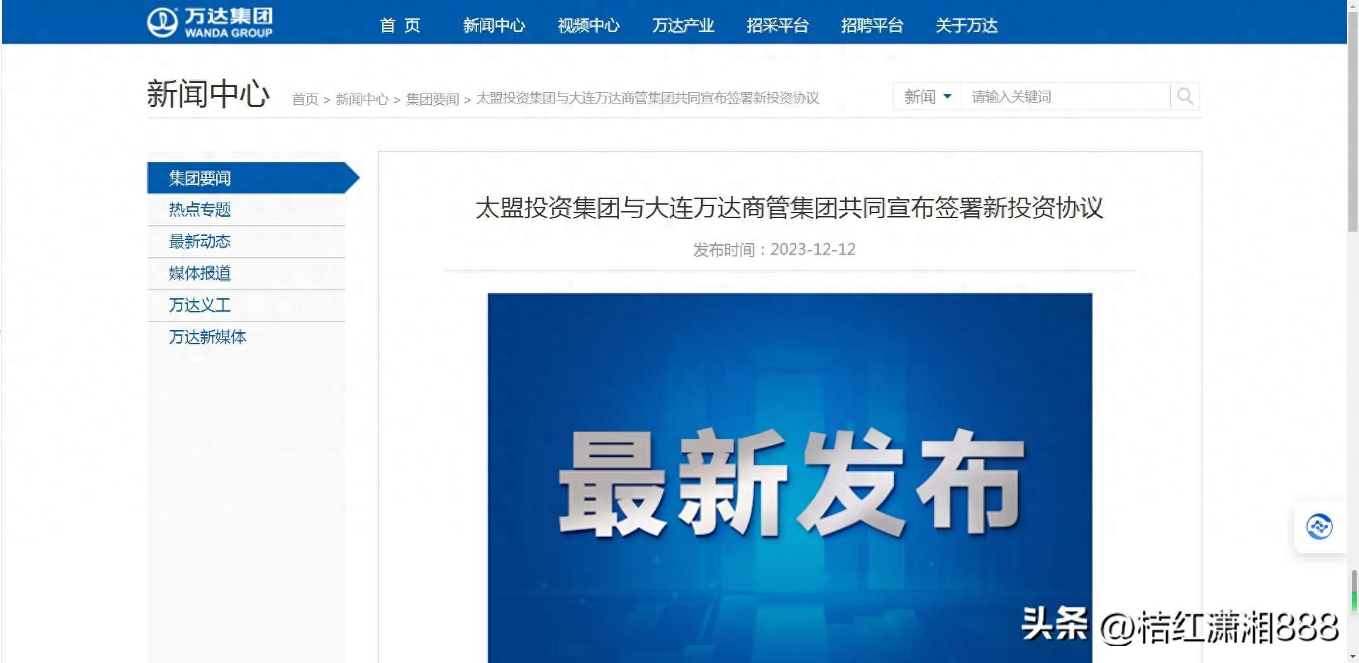 12月12日,大连万达集团在官网发布消息称,太盟投资集团(PAG)与大连万达商管集团共同宣布签署新投资协议。太盟将联合其他投资者,在其2021年的投资赎回期满时,经大连万达商管集团赎回后,对珠海万达商管再投资。