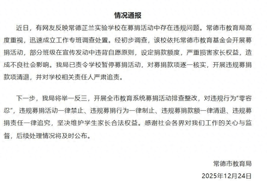 近日,湖南省常德市芷兰实验学校部分班级家委会要求家长向学校教育基金会捐款,且设定“每人不少于1000元”的额度,引发舆论哗然。当地教育局迅速介入,认定此举“违背自愿原则”,责令暂停活动、清退款项并追责。尽管校方此前声称“全程自愿”,但群公告中“保证底线1000”“寓意985、211”等话语,却暴露了“自愿”名义下的隐形强制。这起事件不仅关乎一所学校的募捐行为,更折射出教育公益生态中亟待厘清的边界与原则。