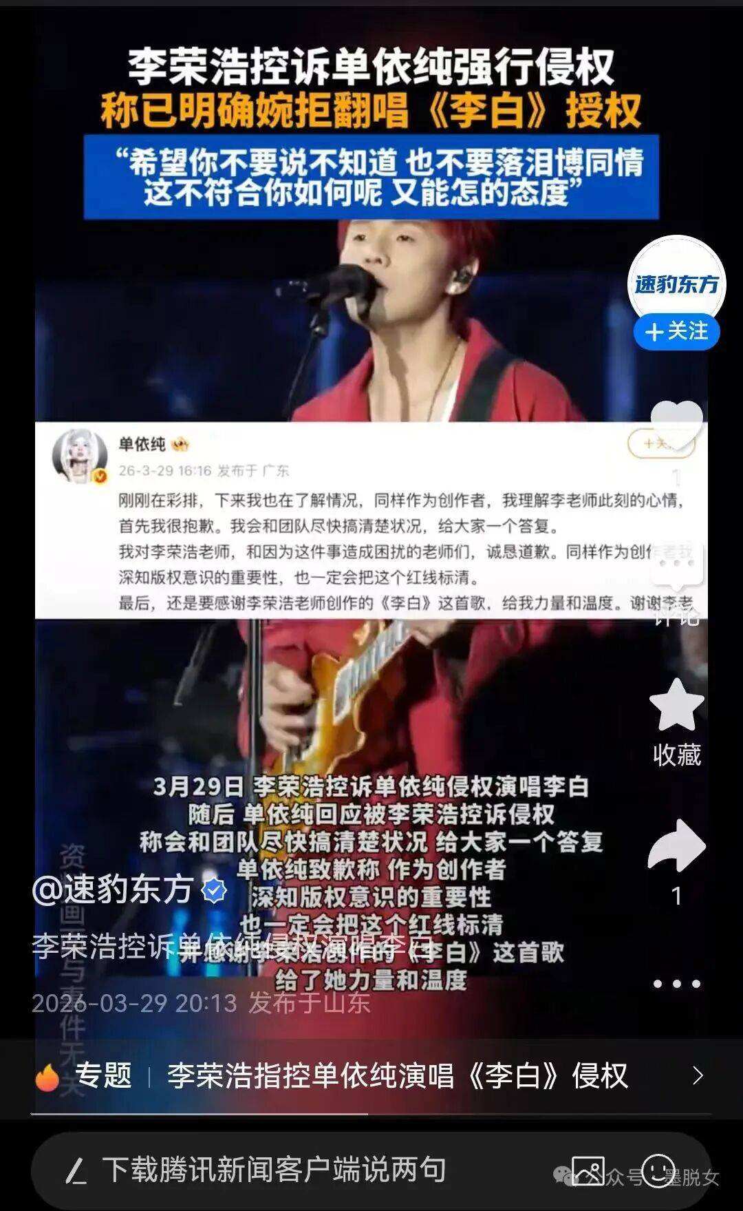 单依纯最初回应称“不知授权未通过”,将责任推给主办方;3月30日凌晨再发长文道歉,承认“未亲自核查授权文件”,承诺停唱《李白》、删除相关宣传物料,并个人承担全额版权费与赔偿。但道歉难掩核心问题:在版权意识日益强化的当下,商业演出未经授权演唱他人作品,且在被明确拒绝后仍执意为之,本质是对原创者劳动成果的轻蔑,对行业基本规则的公然践踏。李荣浩直言“若想要钱,从一开始就会授权”,其维权核心并非经济诉求,而是捍卫“先授权后表演”的行业底线,抵制“先侵权后补救”的潜规则。