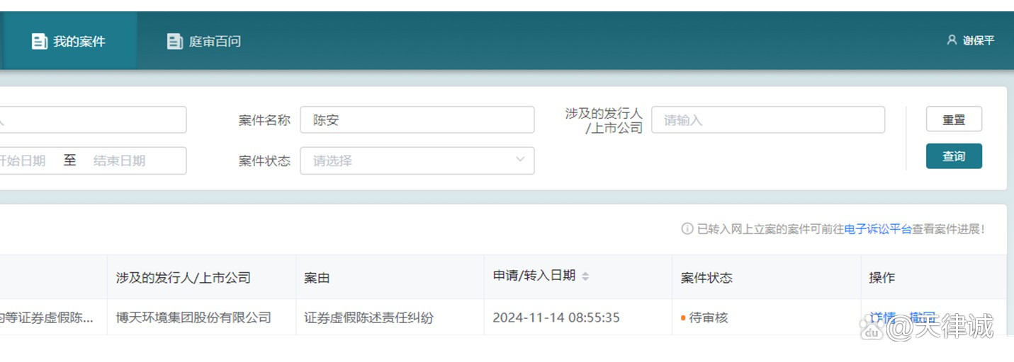 2024年11月14日,谢保平律师金融证券团队代表一批受损的投资者,正式向北京金融法院提交了针对博天环境(股票代码:603603)的虚假陈述索赔立案材料。这些投资者因博天环境信息披露违法违规行为遭受损失,故依法提起诉讼,寻求公正赔偿。