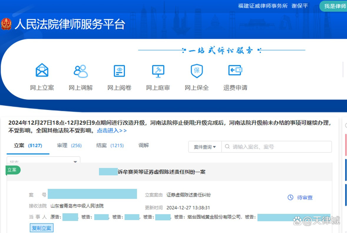 2024年12月27日,由谢保平律师领导的金融证券团队向山东省青岛市中级人民法院递交了一批新的针对600766园城股份的投资者索赔立案材料。此举标志着对该公司涉嫌违规行为的追责行动仍在持续进行中。