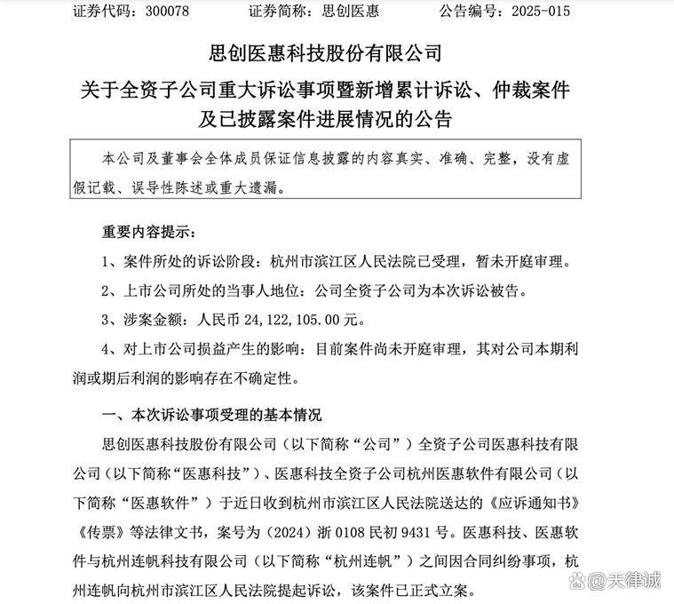 2025年2月12日,300078思创医惠发布《关于全资子公司重大诉讼事项暨新增累计诉讼、仲裁案件及已披露案件进展情况的公告》。思创医惠全资子公司医惠科技有限公司、医惠科技全资子公司杭州医惠软件有限公司于近日收到杭州市滨江区人民法院送达的《应诉通知书》《传票》等法律文书,案号为(2024)浙0108民初9431号。医惠科技、医惠软件与杭州连帆科技有限公司之间因合同纠纷事项,杭州连帆向杭州市滨江区人民法院提起诉讼,该案件已正式立案。