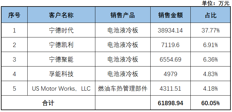 上表为公司2022年前五大客户,销售占比为60.05%,其中第一大客户宁德时代销售金额为3.89亿元,占比为37.77%,宁德凯利为第二大客户,销售金额为0.71亿元,占比为6.91%,宁德聚能为0.66亿元,占比为6.36%。以上对前三大客户销售产品俱为电池液冷板。前三大客户还有一个共同点就是企业名称都是以“宁德”二字打头,但公司并未以“宁德系”合并销售收入。