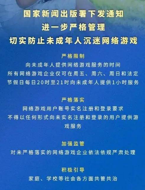 2021年8月30日,国家新闻出版署发布《关于进一步严格管理切实防止未成年人沉迷网络游戏的通知》。其中对所有网络游戏企业给出明确指示: