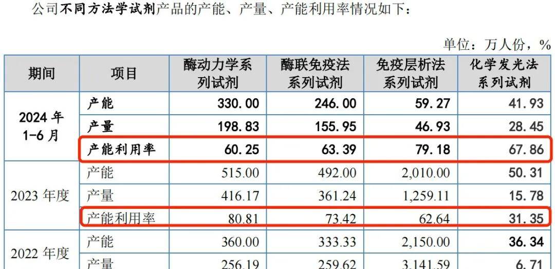 然而,公司的产能利用率并不饱和。以2023年的数据为例,丹娜生物的各类产品的产能利用率最高也不过80.81%,而化学发光法系列试剂的产能利用率仅有31.35%。