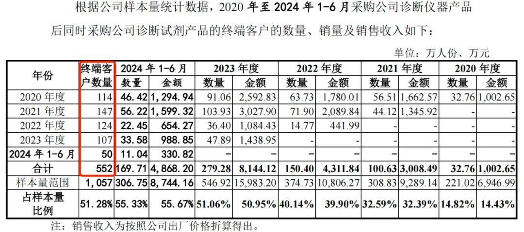 然而,2020年-2024年上半年,采购丹娜生物诊断仪器产品后同时采购公司诊断试剂产品的终端客户的数量分别为114家、147家、124家、107家和50家,2022年开始丹娜生物的该类客户数量便有所下滑。