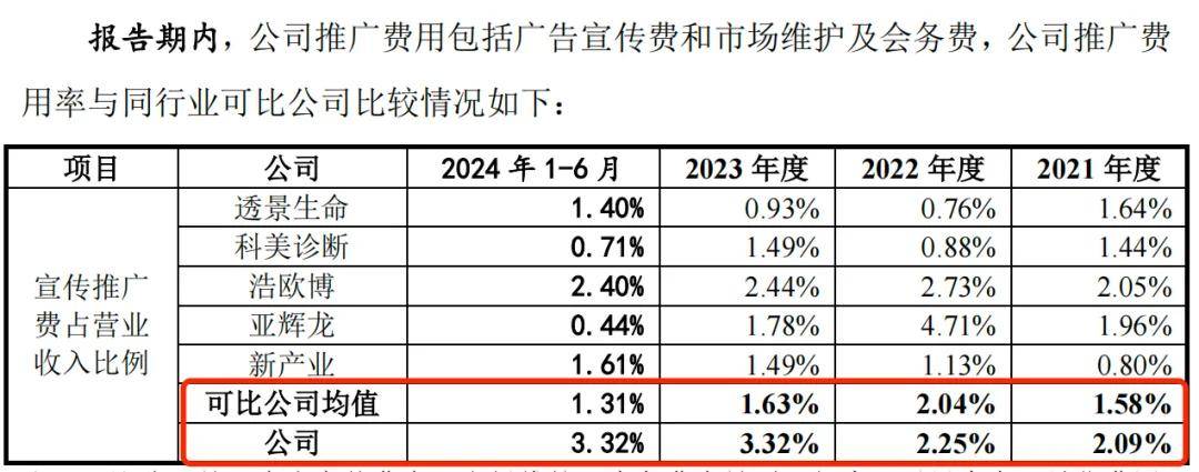 丹娜生物的销售费用中的推广费用,包括广告宣传费和市场维护及会务费。报告期内,其推广费率分别为2.09%、2.25%、3.32%和3.32%,远高于同行可比公司平均值1.58%、2.04%、1.63%和1.31%。