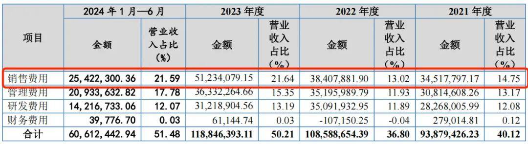 报告期内,丹娜生物的销售费用分别为3451.78万元、3840.79万元、5123.41万元和2542.23万元,占当期营业收入的比例分别为14.75%、13.02%、21.64%和21.59%。