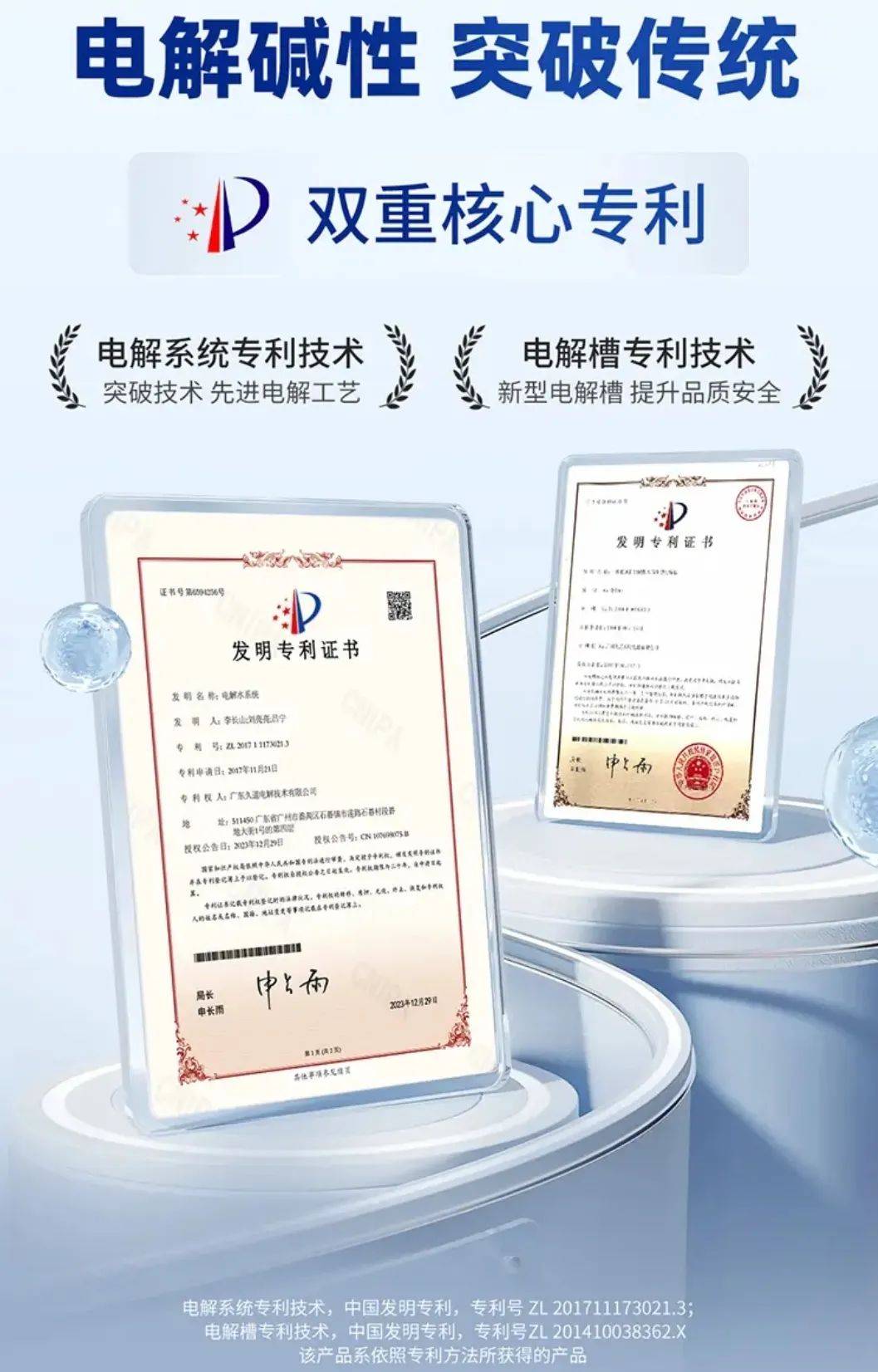 要知道,一般的碱性水通过添加小苏打实现碱化,所以有涩味。而9.0电解碱性水则依托其独有的双重国家专利——电解系统专利技术及新型电解槽专利技术,全程不添加小苏打,而是基于电极的氧化还原反应,分离出碱性水,实现入口顺滑无涩感。这也是产品名称中“电解”二字的由来与价值所在。
