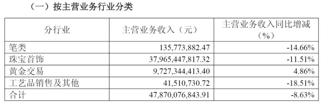 截至2025年三季度末,公司黄金珠宝首饰的总门店数量为5625家,较2024年底的5838家净减少213家。