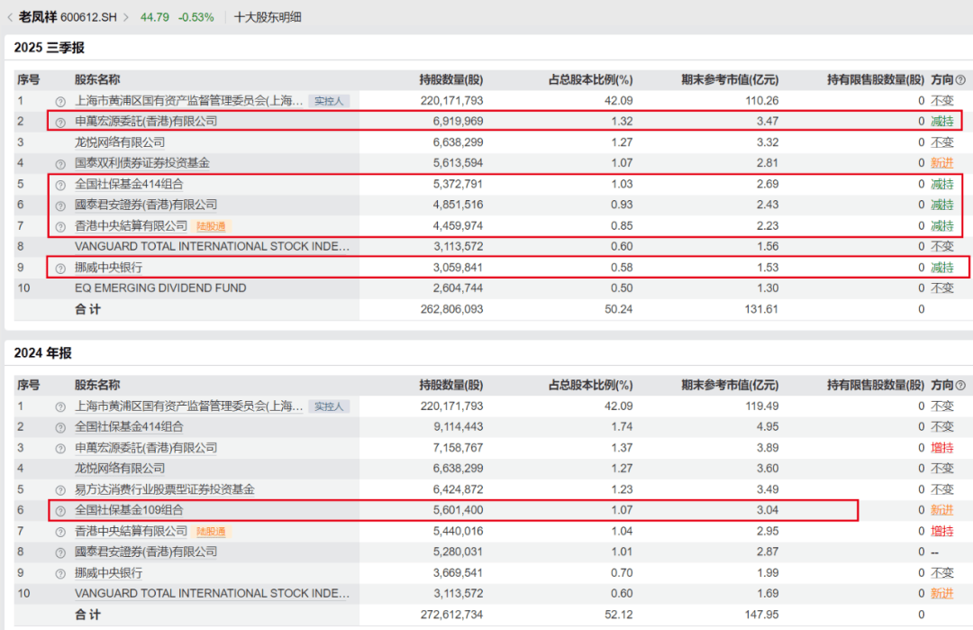 和2024年底的十大股东相比,今年前三季度,有5家股东在减持老凤祥,全国社保基金109组合则退出了前十大股东行列。