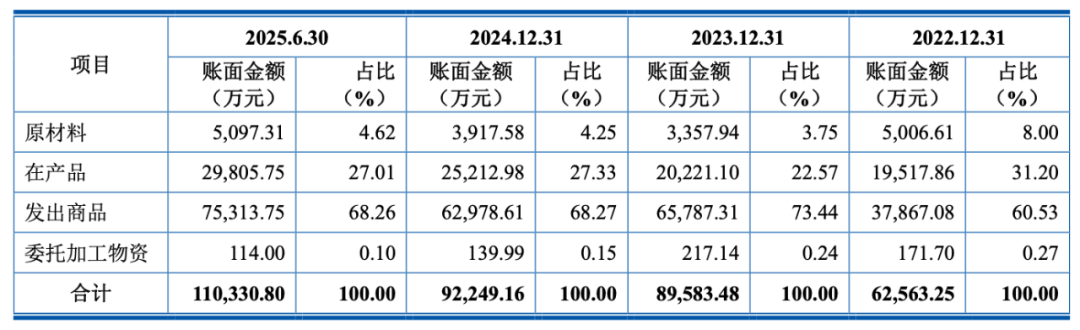 在存货的构成中,又以发出商品占比最高,报告期各期末分别为60.53%、73.44%、68.27%和68.26%。